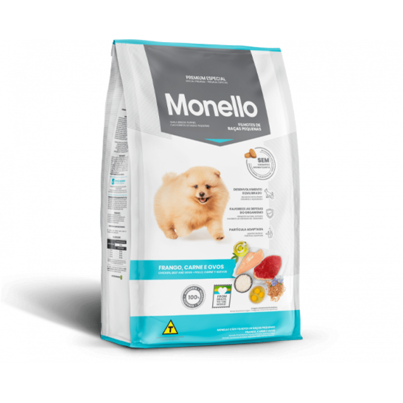 MONELLO PREMIUM CACHORROS DE RAZAS PEQUEÑAS – POLLO, CARNE Y HUEVOS Monello Cachorros Razas Pequeñas Pollo, Carne y Huevos es un producto completamente nuevo en la línea de alimentos. Con partícula adaptada, proporciona masticación fácil y una comida más sabrosa. La adición de aceite de salmón ayuda en la maduración cognitiva, necesaria para el crecimiento sano. La fórmula aún cuenta con la presencia de huevos en polvo. • Contiene Linasa, Aceite de salmón, huevo en polvo, MOS, Extracto de yucca schidigera, Y Hexametafosfato de sódio. • 30% proteína - 12% grasa - • 3,950 kcal/kg